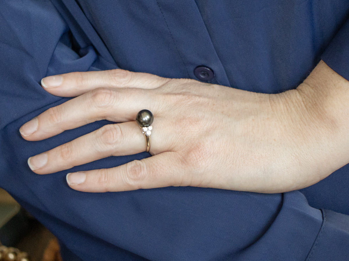 This black pearl and diamond ring is a sophisticated statement piece that pairs the mysterious allure of lustrous, newly set black pearls with the timeless sparkle of diamonds. This elegant ring celebrates the perfect marriage of classic luxury and modern edge, where deep, sophisticated pearl tones meet brilliant diamond accents for an unforgettable look.