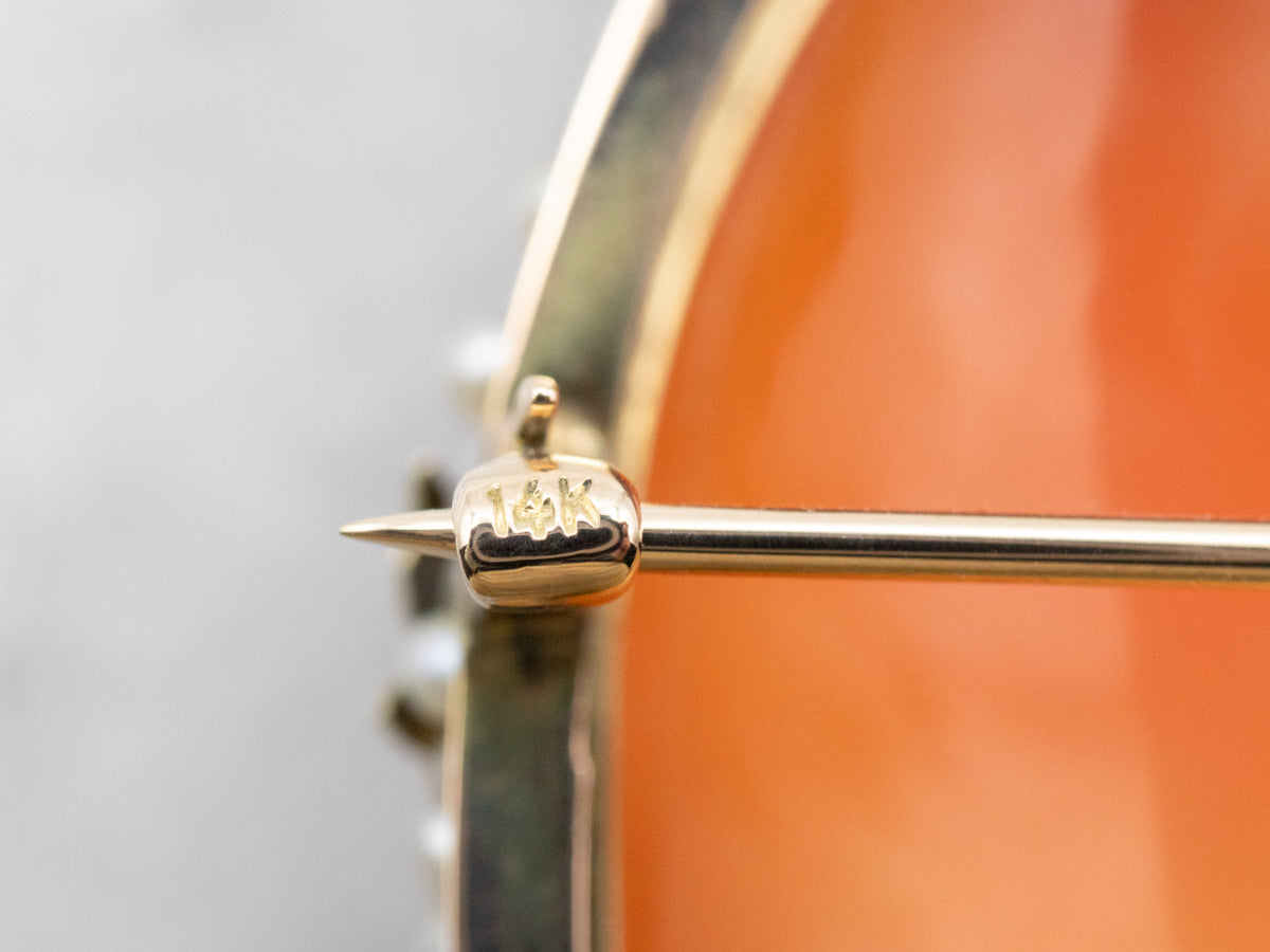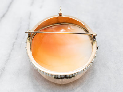 This cameo features wonderful, crisp details, and a great contrast between the creamy white carving and the soft russet of the background. A string of seed pearls pulls the piece together, drawing on the color of the profile and the floral details of the gold.