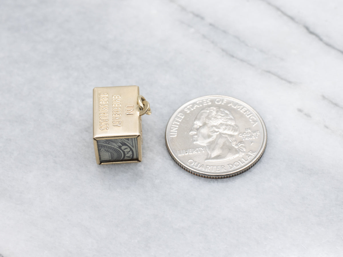 This quirky charm is wonderfully crafted! Made of 14-karat gold, this money box reads "In Emergency Break Glass" with glass and a dollar bill inside. This fantastic, detailed pendant is ready to wear or give as a great, funny gift!