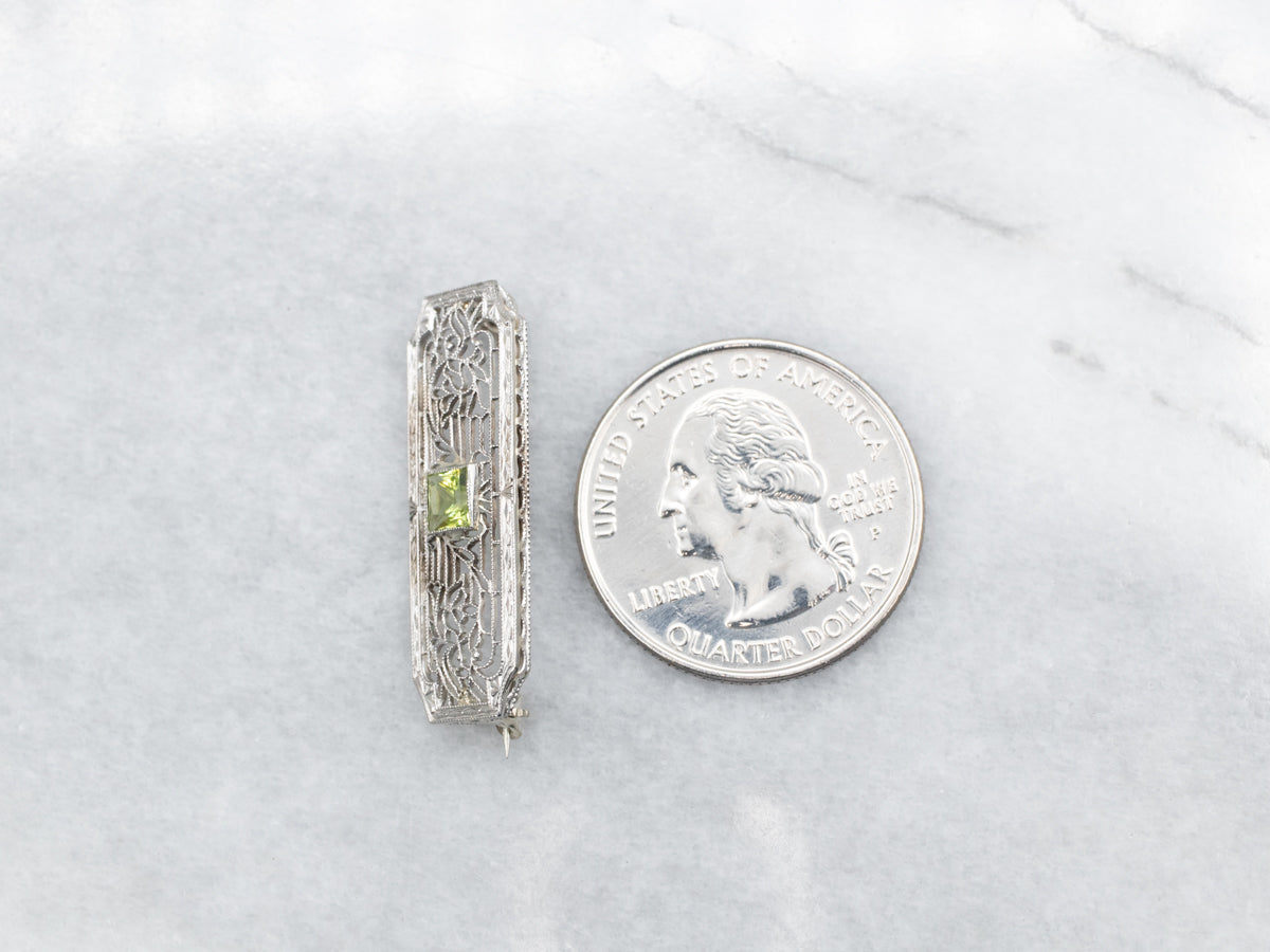 This peridot was an easy choice for us to set in this brooch. The white gold filigree surrounds the square cut peridot, bezel set for extra security. Embrace the beauty of the Art Deco era with this peridot brooch.