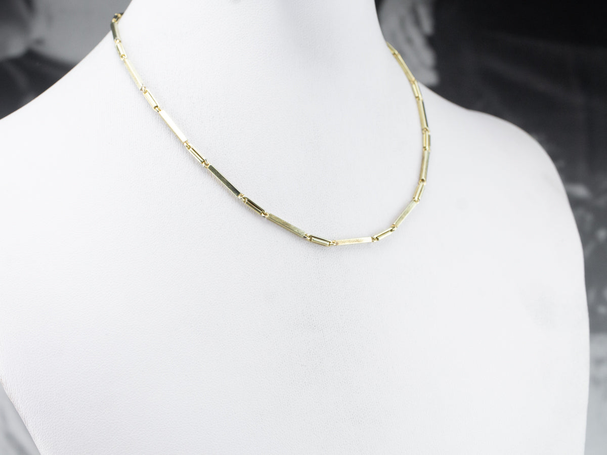 This handsome pocket watch chain dates to the early 1900's! Each 14 karat green gold link is sturdy and well crafted, with alternating styles of bars that form a sophisticated pattern. This chain would make a stylish suit accessory, or could even be wrapped around the wrist as a bracelet!