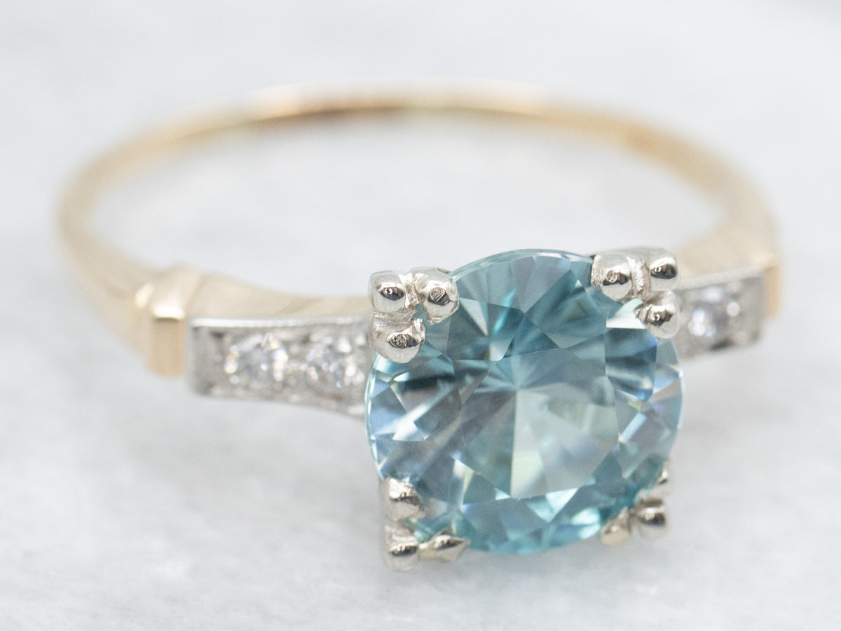 Metal: 14K Yellow and White Gold Gem: Blue Zircon 3.19 Carats Gem Measurements: 8.6 mm, Round Accents: 4 Diamonds totaling .07 Carats, SI-I in Clarity, H-I in Color Ring Size: 9.25 Marks: "14K PURITY" Stamped on the inside band