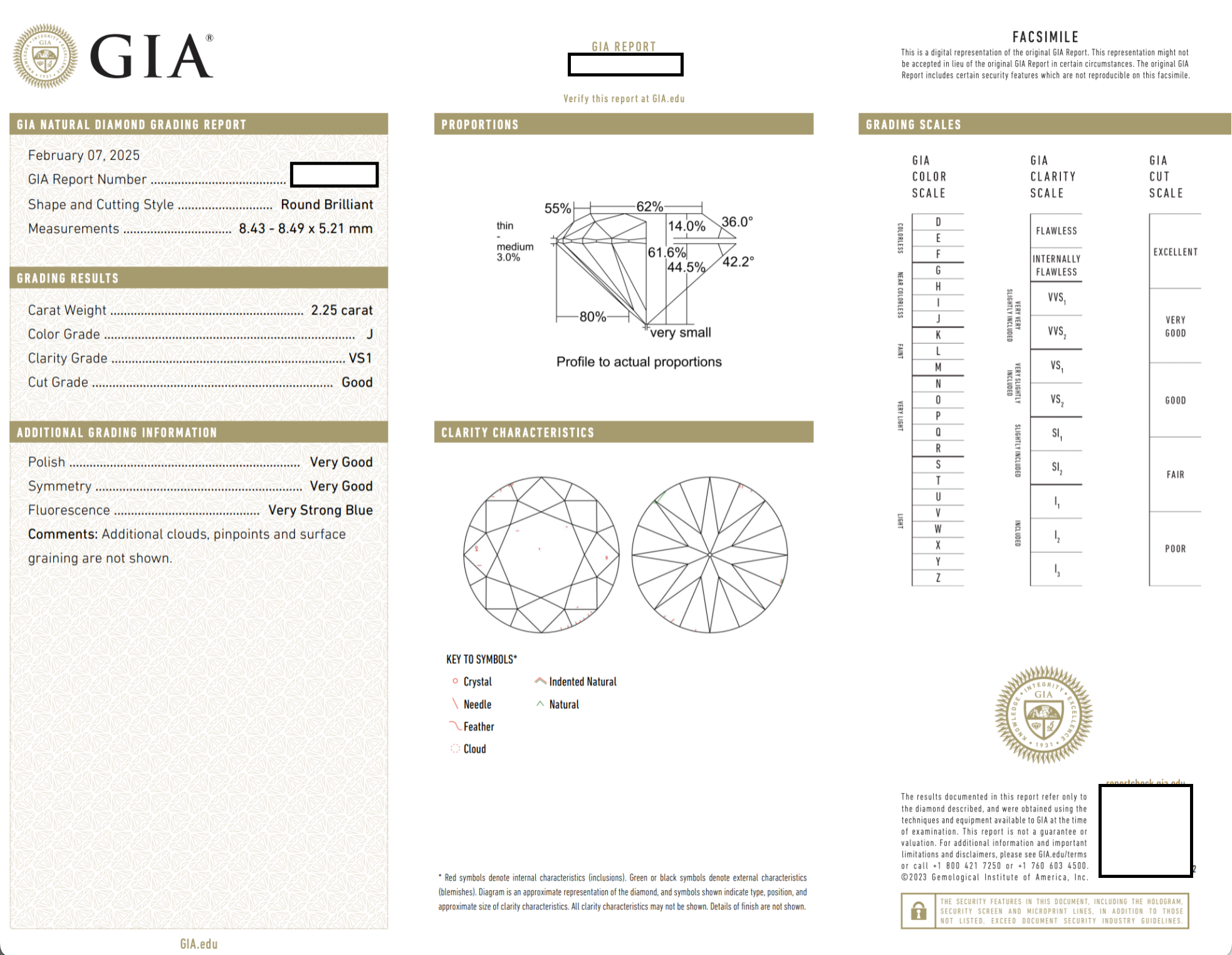 Metal: Platinum Gem: GIA Diamond 2.05 Carats, J in Color, VS1 in Clarity Gem Measurements: 8.4 mm, Round Cut Accents: 2 Diamonds totaling .30 Carats, H in Color, VS1 in Clarity Ring Size: 7.75 Marks: "PLAT" Stamped on the inside band GIA Report Number: 523********