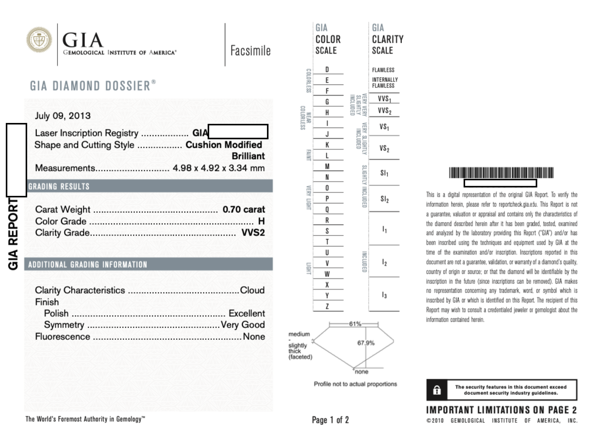 Metal: 14K White Gold Gem: Diamond .70 Carats, VVS2 in Clarity, H in Color Gem Measurements: 4.9 mm, Cushion Cut Accents: 14 Diamonds totaling .15 Carats, SI in Clarity, G-H in Color Ring Size: 4.75 Marks: "14K" Stamped on the inside band GIA Report Number: 515********