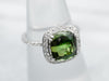 Metal: 14K White Gold Gem: Green Tourmaline 2.53 Carats Gem Measurements: 8.0 mm, Square Cushion Cut Accents: 43 Diamonds totaling .50 Carats, G-H in Color, SI in Clarity Ring Size: 5.50 Marks: "BB 14K" Stamped on the inside band