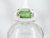 This lovely green tourmaline halo ring is full of refined glamour! The white gold mounting is encrusted with glittering diamonds, allowing the ring to sparkle even in profile. The tourmaline is a rich, juniper green color that contrasts beautifully with the polish of the metal.