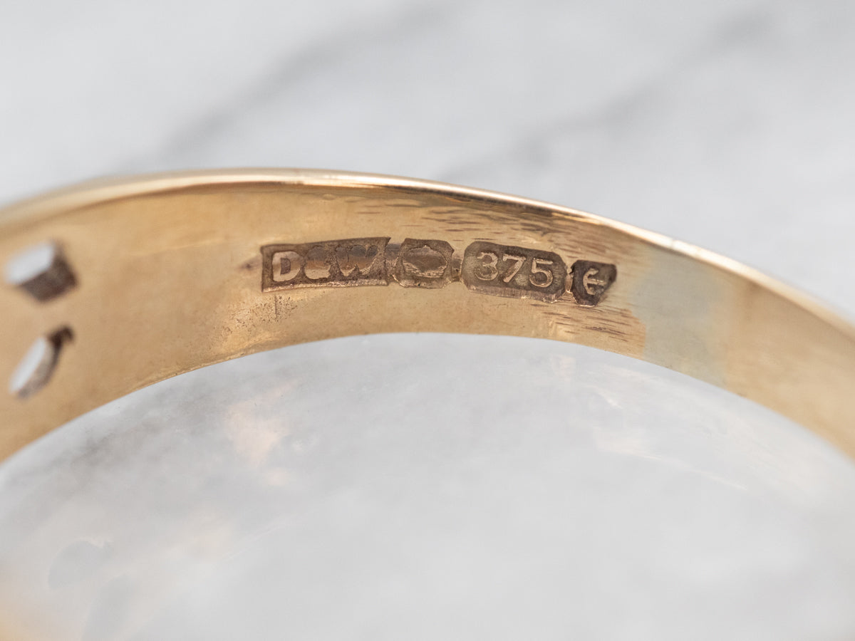 Metal: 9Ct Yellow Gold Gem: Diamond .02 Carats, I1 in Clarity, J in Color Gem Measurements: 1.7 mm, Round Accents: 6 Rubies totaling .51 Carats Ring Size: 5.50 Marks: "[D&W][][375][]" Stamped on the inside band
