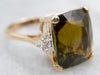 Metal: 14K Yellow Gold Gem: Tourmaline 11.15 Carats Gem Measurements: 11.8 x 14.3 mm, Cushion Cut Accents: 6 Diamonds totaling .18 Carats, SI in Clarity, G-H in Color Ring Size: 7.25 Marks: "14K" Stamped on the inside band