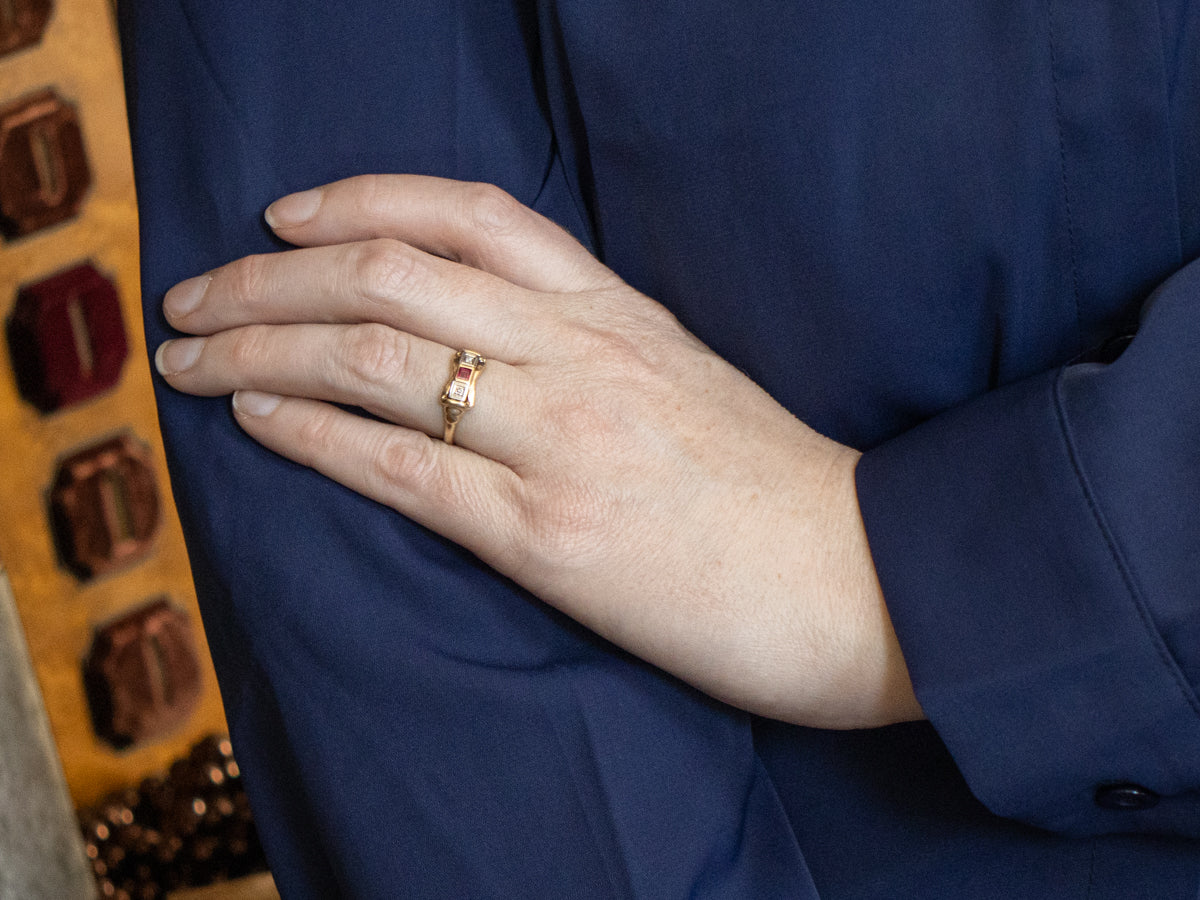 This Retro Era synthetic ruby ring has a fabulous structure and design. Bold architectural shoulders transition into a rectangular head holding two sparkling diamonds. The band-like design sits comfortably on the finger, substantial-looking without being too heavy.