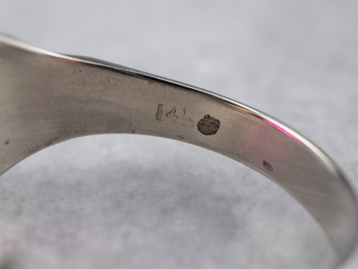 This classic 14 karat white gold ring with its fine engraving is from the Art Deco era. This ring is set with a bold and bright barrel cut synthetic ruby, which pops against the background of the polished metal. Originally worn by a man, this ring is suitable for any gender!