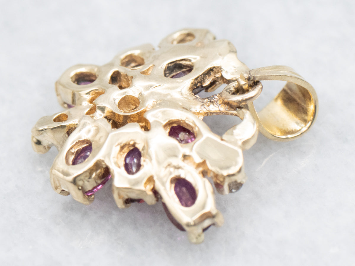 Metal: 14K Yellow Gold Gem: 5 Diamonds totaling .06 Carats, J-K in Color, I in Clarity Gem Measurements: 2.0 mm, Round Accents: 8 Rubies totaling 1.50 Carats Measurements: 18 x 21 mm, with bail Marks: "Slivma 14K" Stamped on the reverse