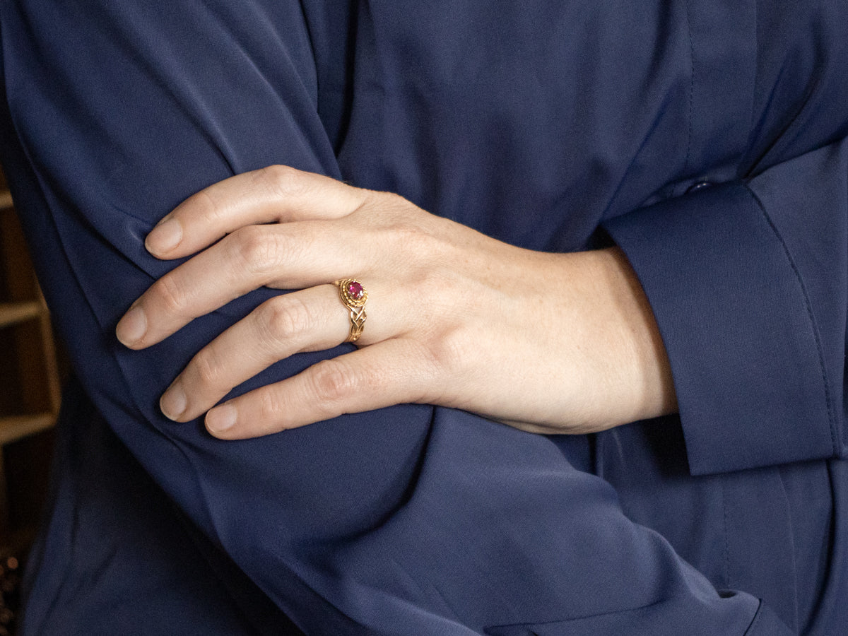 This exquisite ruby solitaire ring features a striking twisted frame that elegantly encircles a vibrant ruby centerpiece. Perfect for those who appreciate timeless sophistication, this ring combines two vintage designs into one unique solitaire piece, making it a standout piece for any refined jewelry collection. Its graceful silhouette and rich color make it ideal for special occasions or as a meaningful everyday accessory.