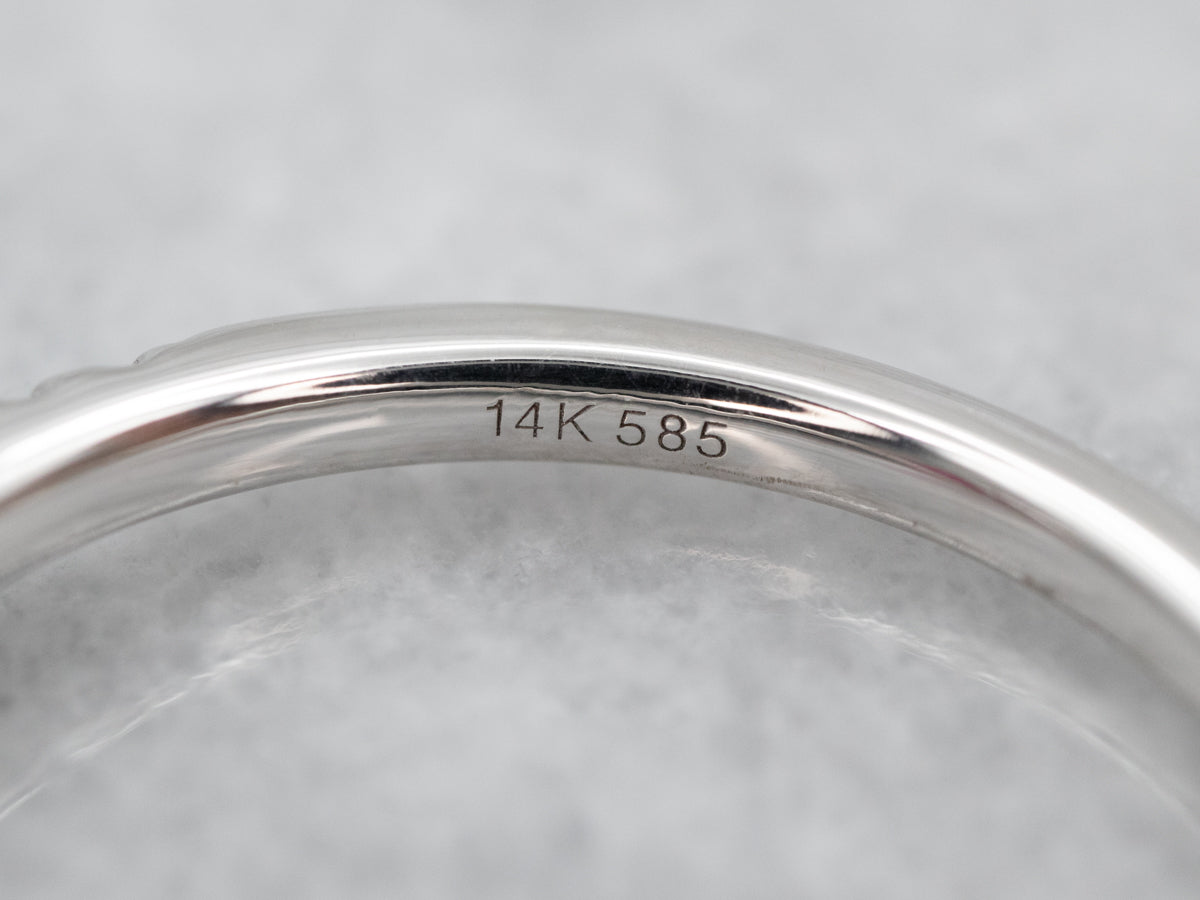 Metal: 14K White Gold Gem: Ruby .50 Carats Gem Measurements: 6.5 x 2.9 mm, Marquise Cut Accents: 14 Diamonds totaling .08 Carats, F in Color, SI in Clarity Ring Size: 6.50 Marks: "14K 585" Stamped on the inside band