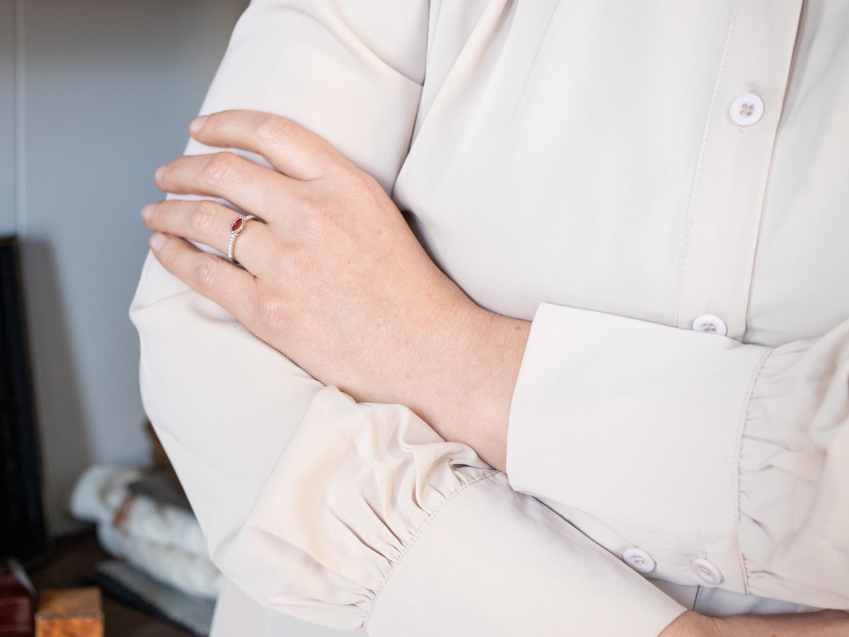 This stunning ring features a ruby of exceptional quality. Vibrant in color, flashes of raspberry create a stunning display. Accent diamonds add sparkle and light, complemented by a simple band crafted of polished white gold.