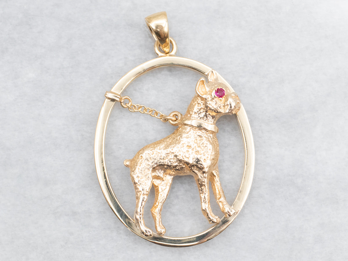 This exquisite pendant is crafted from gleaming yellow gold and features a detailed boxer dog with a stunning ruby eye. Add a touch of elegance and personality to any outfit with this unique and eye-catching piece. Perfect for dog lovers and jewelry enthusiasts alike!
