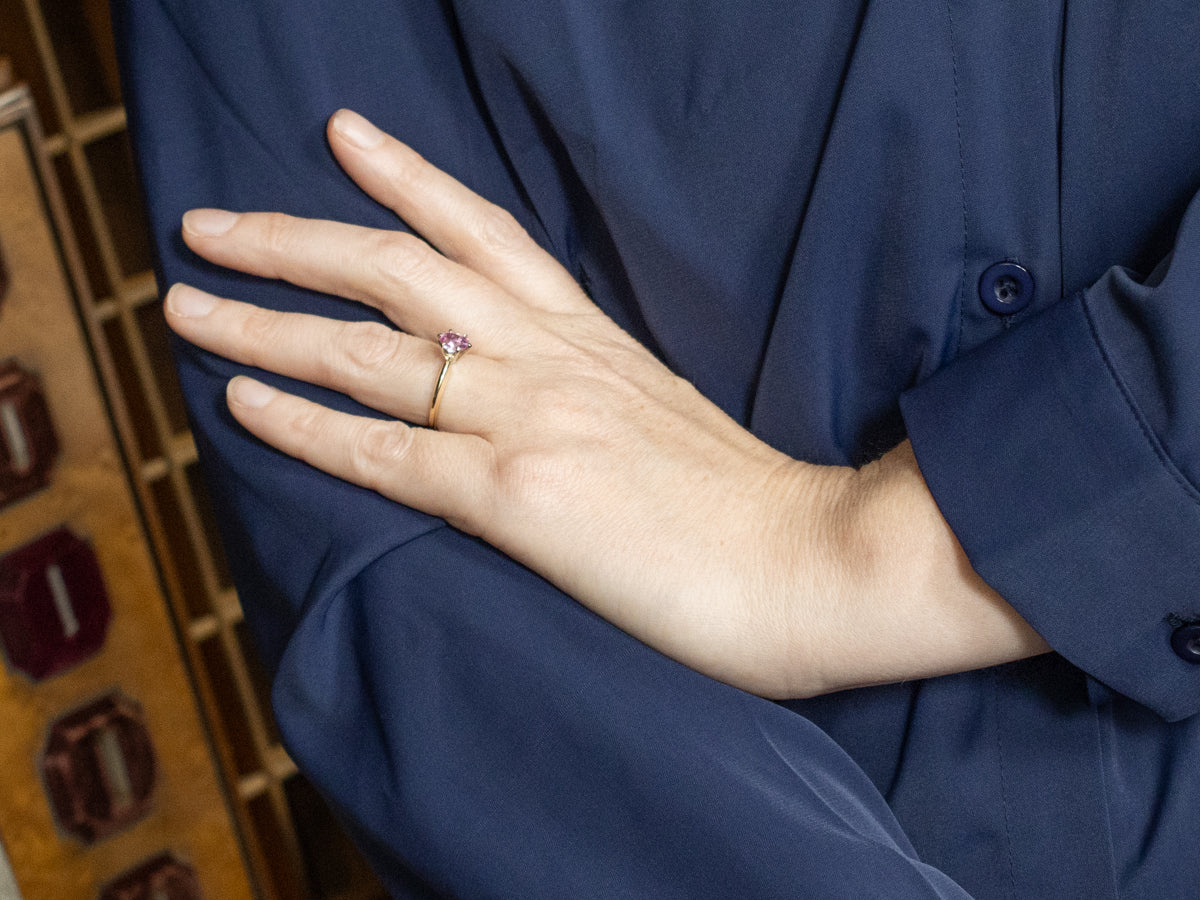 The focal point of this ring is absolutely the bright, sweetly sparkling pink sapphire we've set at the center! The simple engagement mounting is the perfect frame for this hot stone and will sit nicely next to a variety of wedding band styles. The stone is from Sri Lanka, also called Old Ceylon. Sri Lanka is the source of the finest sapphire in the world, and this stone is no exception.