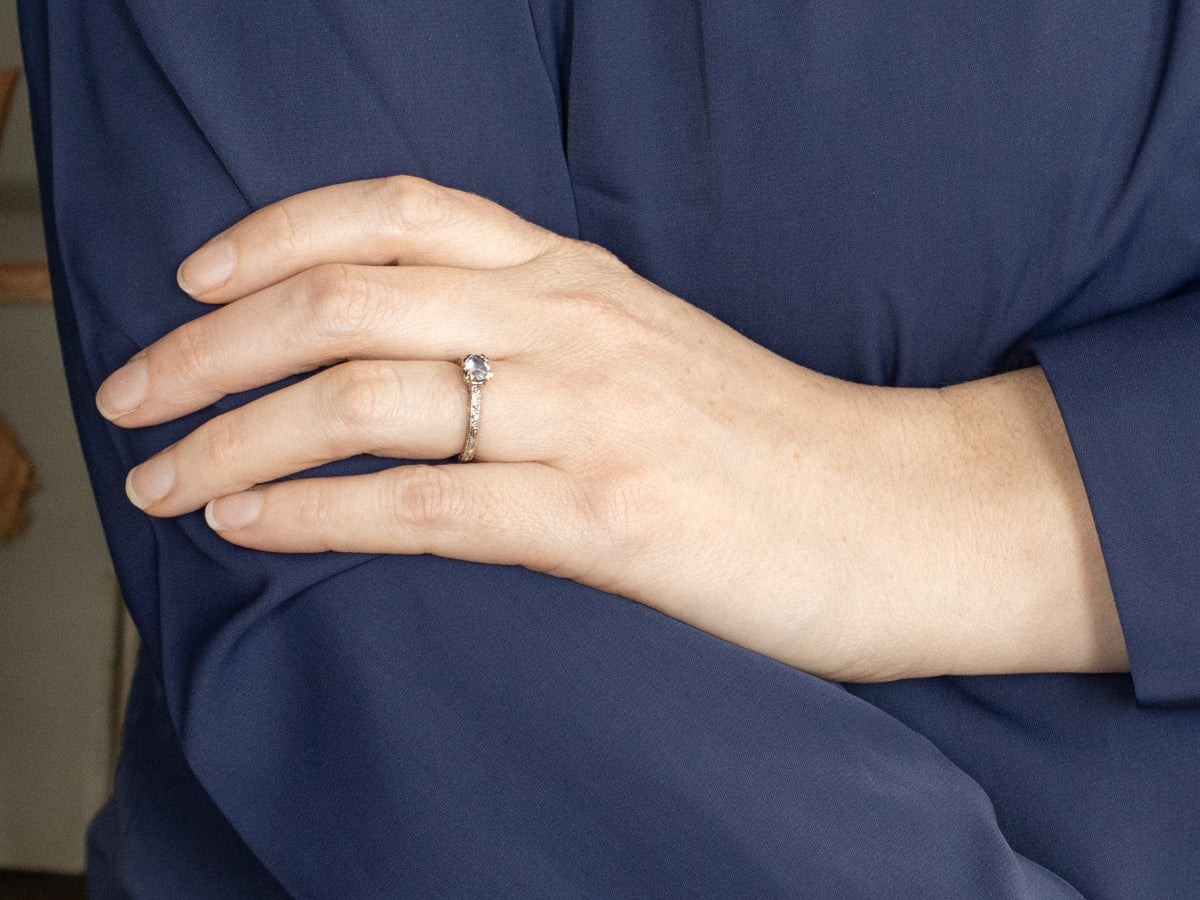 This is a classic Art Carved engagement ring setting, and has a beautiful pattern engraved along its shoulders, giving texture to this lovely solitaire piece! We've set this beauty with a lovely periwinkle-hued purple sapphire, purchased in Sri Lanka on one of our frequent buying trips.
