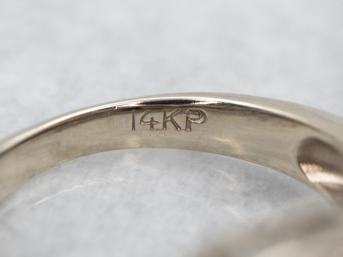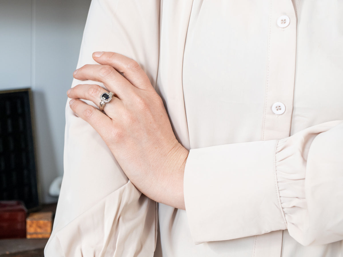 Metal: 14K White Gold Gem: Sapphire 1.37 Carats Gem Measurements: 5.8 x 7.2 mm, Emerald Cut Accents: 28 Diamonds totaling .22 Carats, SI in Clarity, H in Color Ring Size: 6 Marks: "14KP" Stamped on the inside band