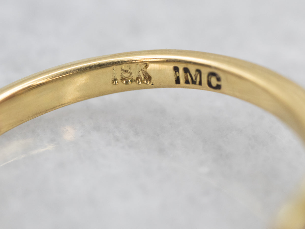 This is a classic engagement ring with clean lines and great proportions! This ring is quite traditional, featuring a solid gold head to hold the stone securely. Polished yellow 18-karat gold shoulders complete the simple look.
