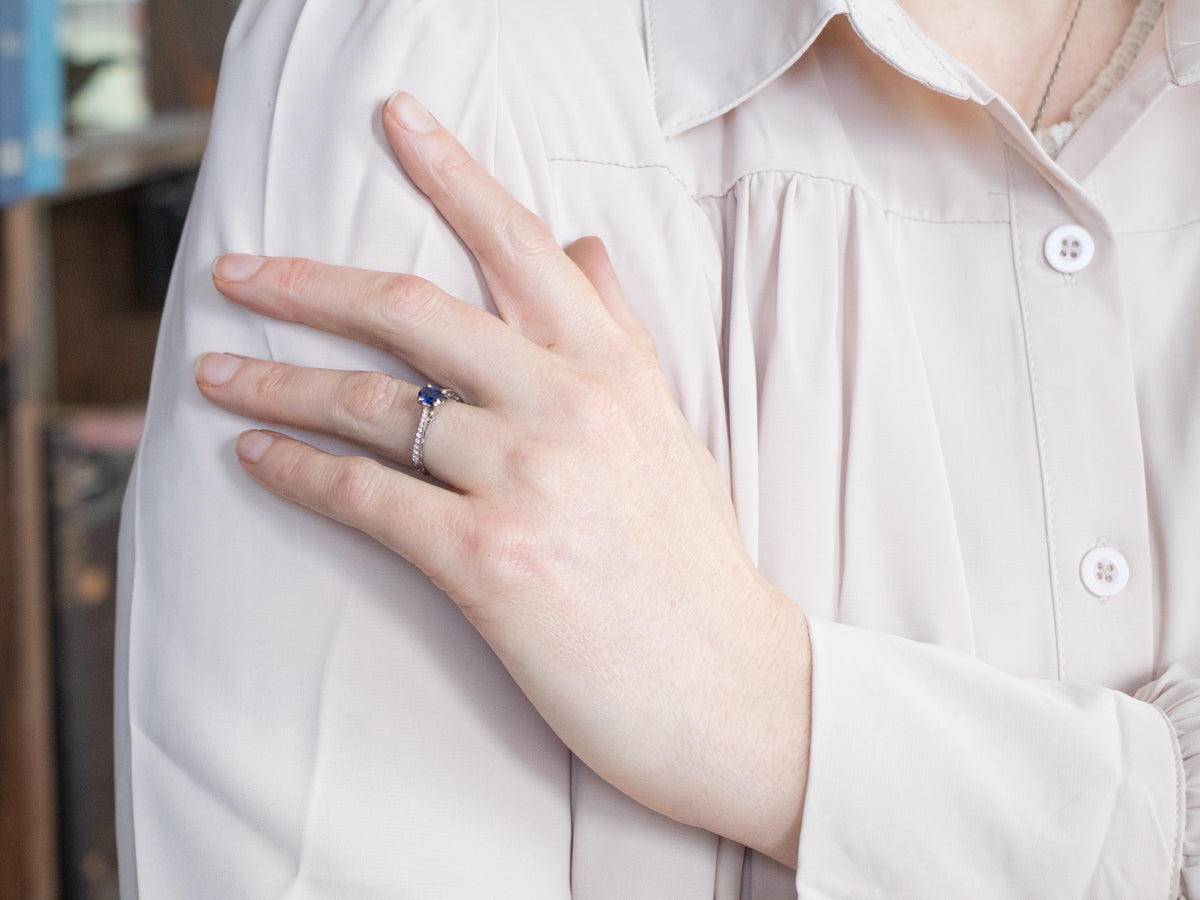Balanced on the hand and substantial without being overwhelming, this is a favorite style of setting for engagement rings! This engraved diamond studded engagement ring with a beautiful sapphire, color is deep, navy blue, with bright sparks of the sky and cerulean radiating from the polished facets!