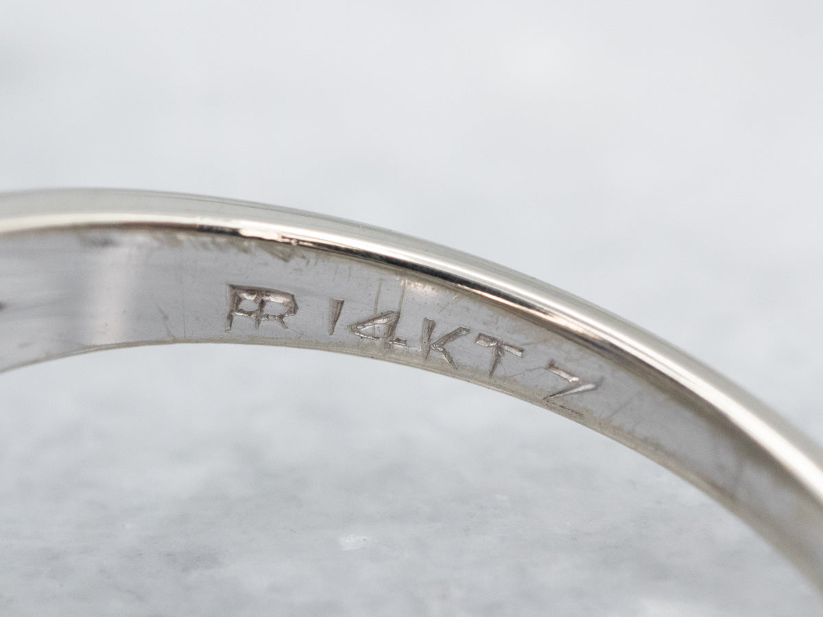 Metal: 14K White Gold Gem: Sapphire 1.19 Carats Gem Measurements: 5.7 mm, Round Accents: 9 Diamonds totaling .22 Carats, SI1 in Clarity, G in Color Ring Size: 6.25 Marks: “14KT Z” Stamped on the inside band