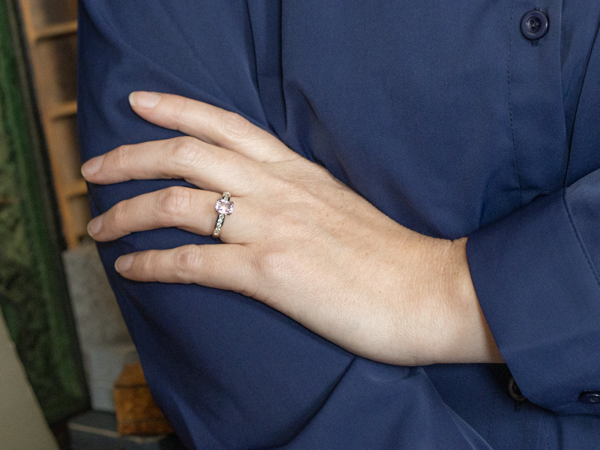 Metal: 14K White Gold Gem: Pink Sapphire 1.50 Carats Gem Measurements: 5.9 x 7.5 mm, Cushion Cut Accents: 10 Diamonds totaling .25 Carats, G-I in Color, SI-I in Clarity Ring Size: 6.50 Marks: "14K W&L" Stamped on the inside band