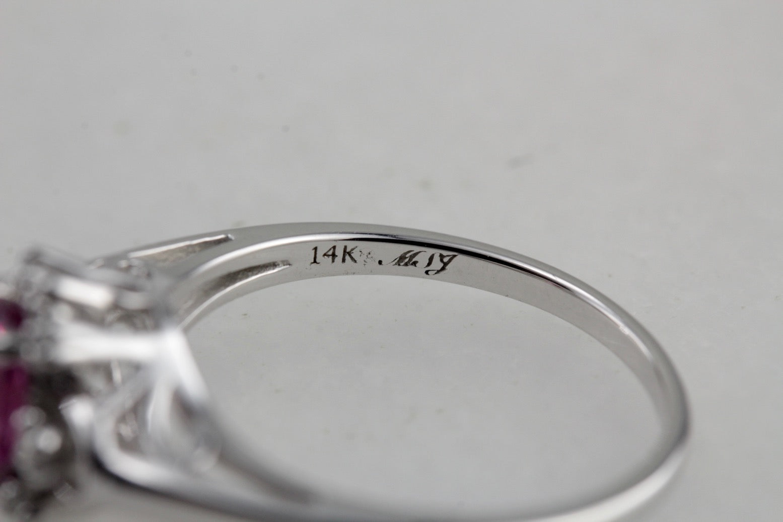 This pink sapphire engagement ring was created from a vintage master model of timeless perfection, the white gold mounting is not a reproduction, not an imitation of an antique style. In fact, it is a true re-issuing of an original design created by a master jeweler, a unique style carved and shaped decades ago, and brought to life again using modern gold casting techniques.