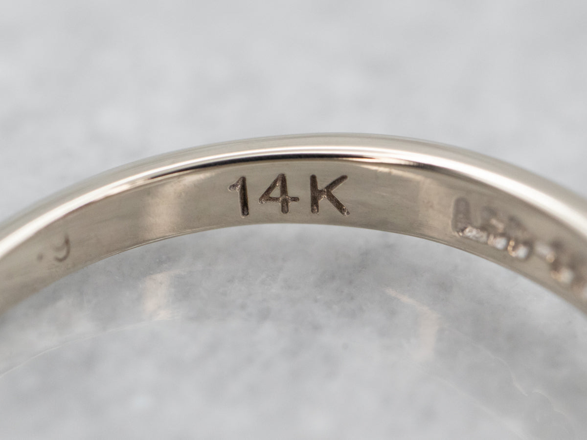 Metal: 14K White Gold Gem: Pink Sapphire .81 Carats Gem Measurements: 5.0 x 6.1 mm, Oval Accent: Diamond .01 Carat, SI in Clarity, G in Color Ring Size: 4.50 Marks: "14K LSG-09" Stamped on the inside band
