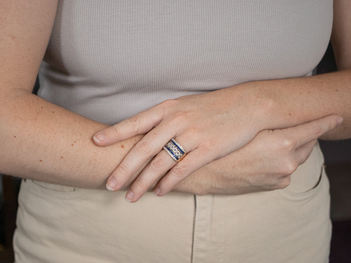 This sapphire and diamond statement band is utterly luxurious, the center is set with stylized diamond flowers, perfectly framed by square cut square sapphires, a glittering row of midnight blue, accented on either side by sparkling diamonds this band is exquisite and is perfect for so many occasions from birthstone to anniversary!
