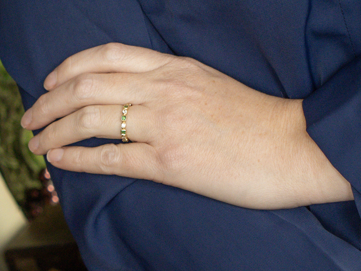 This elegant eternity band showcases a harmonious blend of vibrant square-cut tsavorite garnets and brilliant white sapphires set in lustrous gold. The alternating gemstones create a sophisticated pattern that catches light beautifully from every angle. Perfect for marking life's most meaningful moments, this timeless design combines the rich, verdant allure of tsavorite with the crystalline sparkle of white sapphire, resulting in a piece that transcends seasonal trends and complements any jewelry collection.