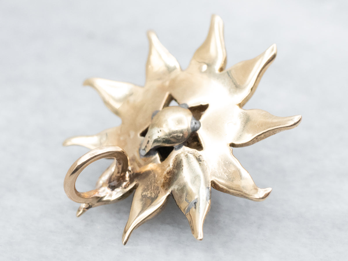 The detailing in this Victorian flower pendant is nothing short of stunning! Lustrous tiny seed pearls set amongst the petals. The center pearl has a creamy hue with champagne undertones!