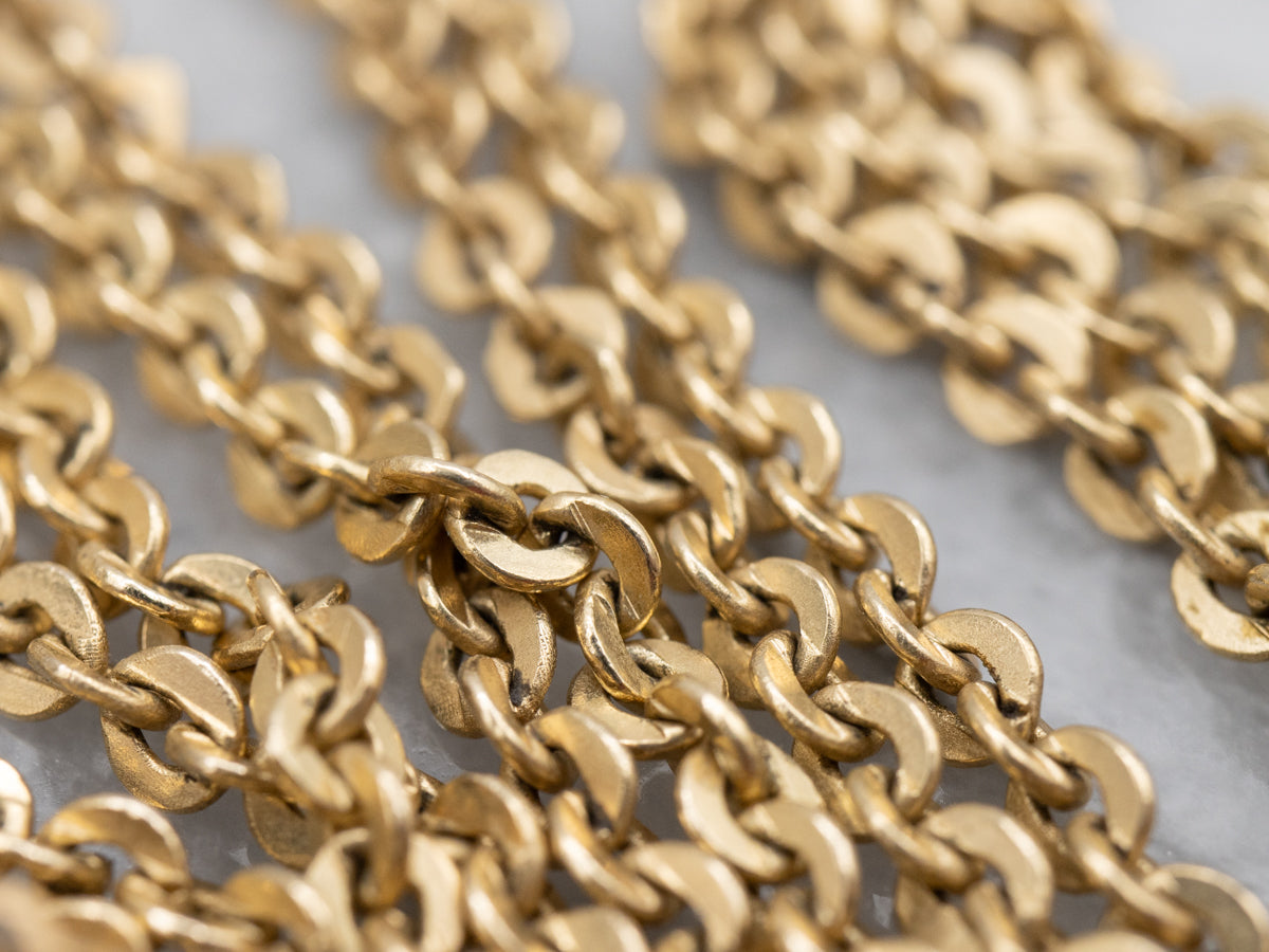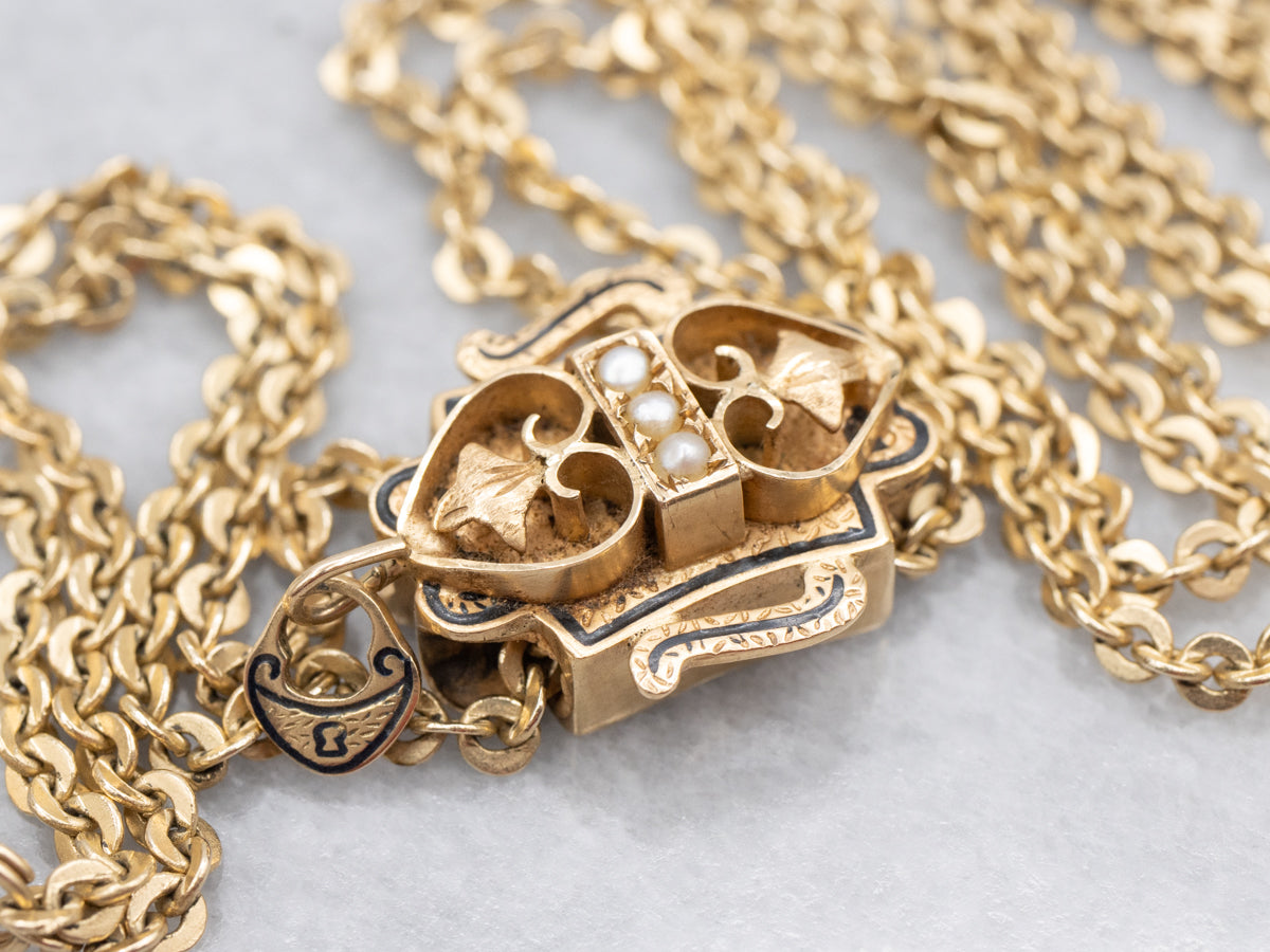 Metal: 14K Antique Gold Gem: Seed Pearls Gem Measurements: 1.6 mm, Round Material: Black Enamel Width of Chain: 2.7 mm Length of Chain: 32 Inches Marks: "14K" Stamped