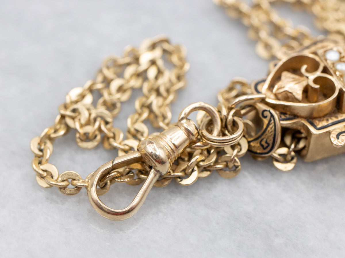 Dating to the late 1800s or early 1900s, this Victorian chain was intended for a lady's pendant watch or chatelaine. Crafted with a now quite collectible slide inlaid with a single seed pearl, this slide feature keeps the two chains from twisting! This is a rare piece, one that will only increase in value over the decades to come.