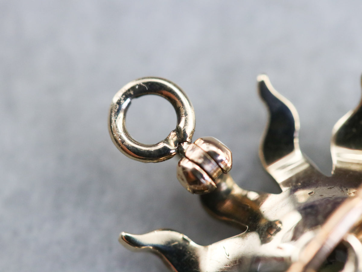 So beautiful! This pretty antique gold brooch or pendant is paved with dove grey seed pearls, each one individually set. Small enough to wear on a lapel or at the collar, this would make a lovely gift for the Mother of the Bride!