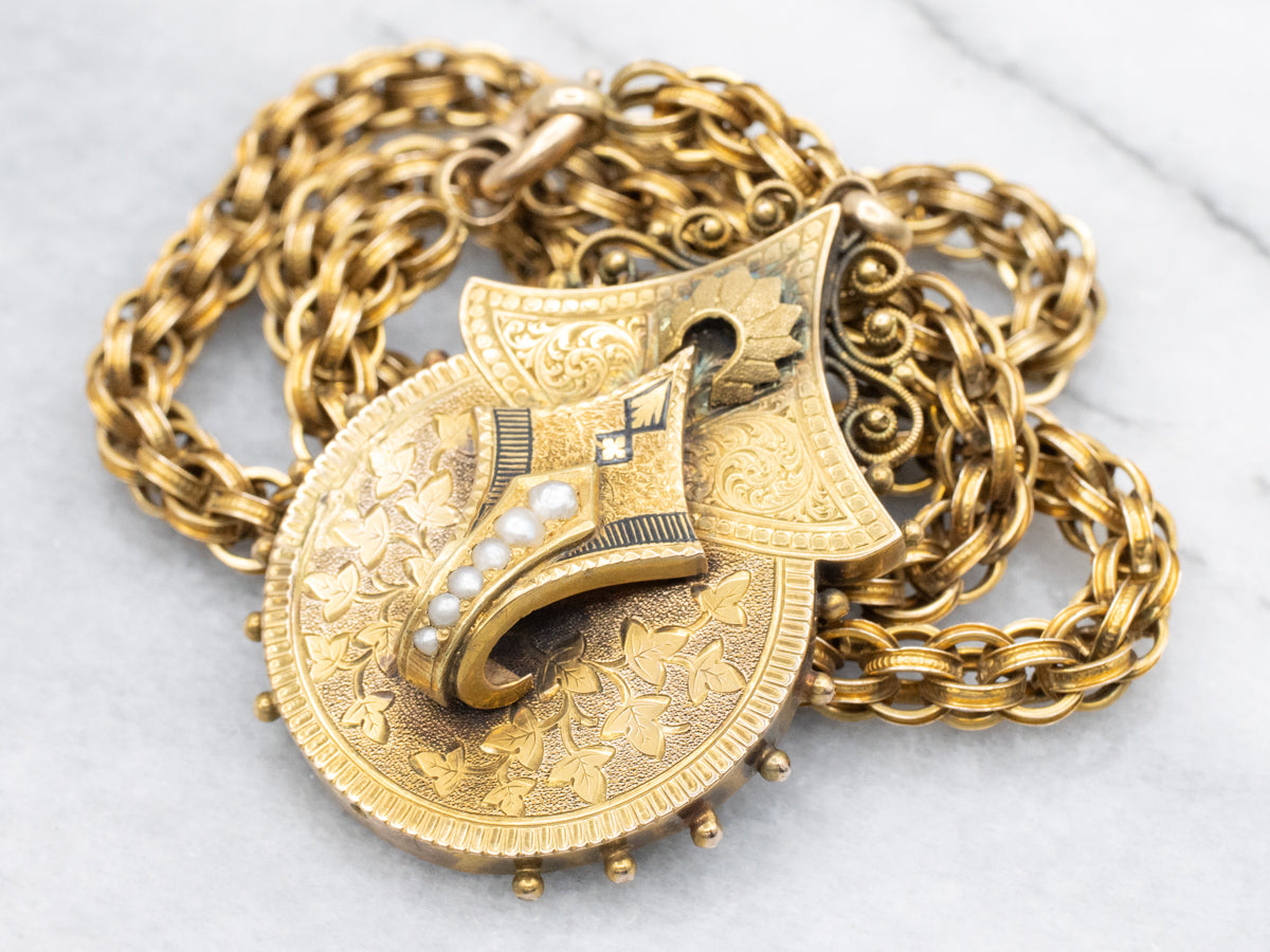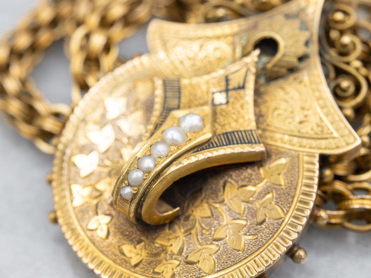 This is an exquisite Victorian statement necklace, featuring delicate black enamel accents paired with creamy seed pearls. The intricate woven gold links create a timeless design that captures the elegance of a bygone era while making a bold, sophisticated impression. Perfect for special occasions or adding a touch of antique charm to your everyday look, this necklace embodies refined craftsmanship and enduring beauty.