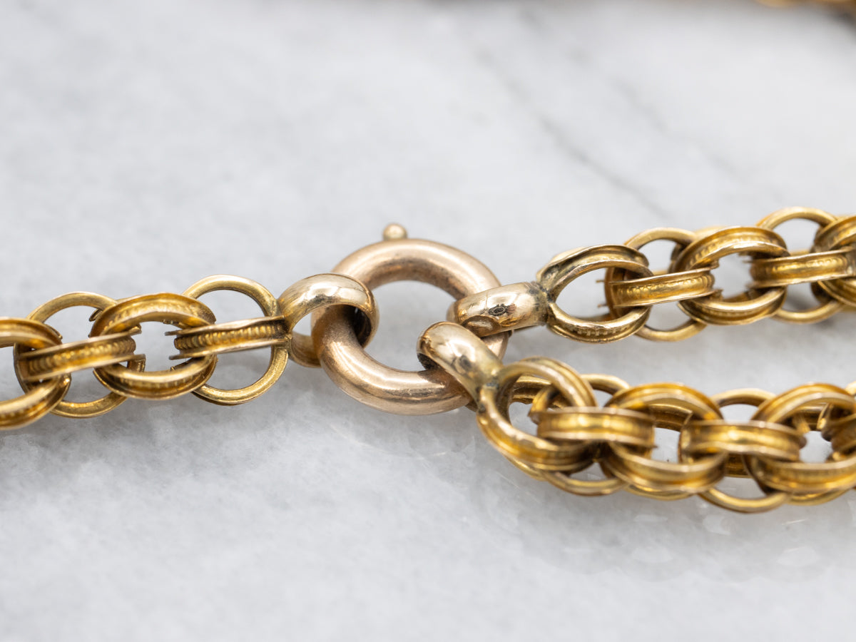 Metal: 14K Antique Yellow Gold Gem: 6 Seed Pearls Gem Measurements: 3.0 mm, Round Width of Chain: 34.0 mm Length of Chain: 18 Inches long with 2-inch drop