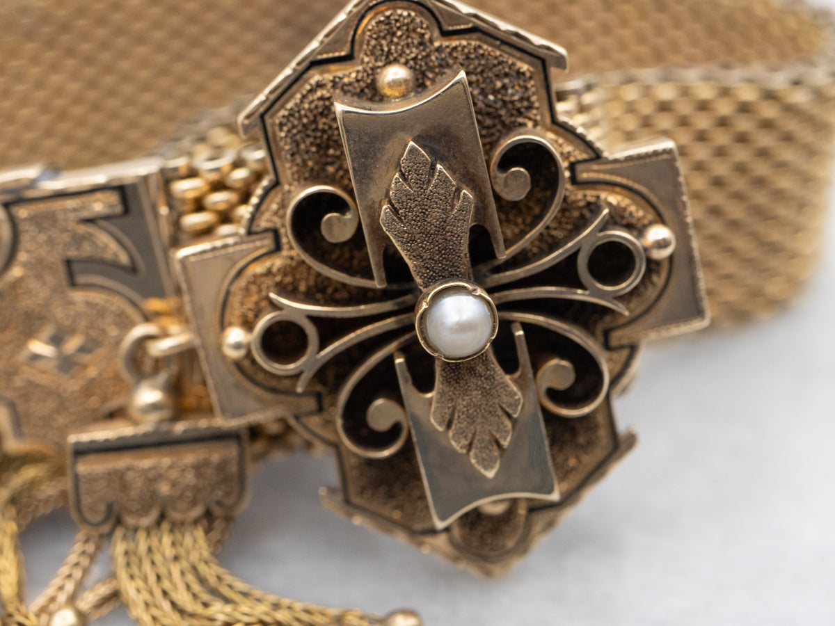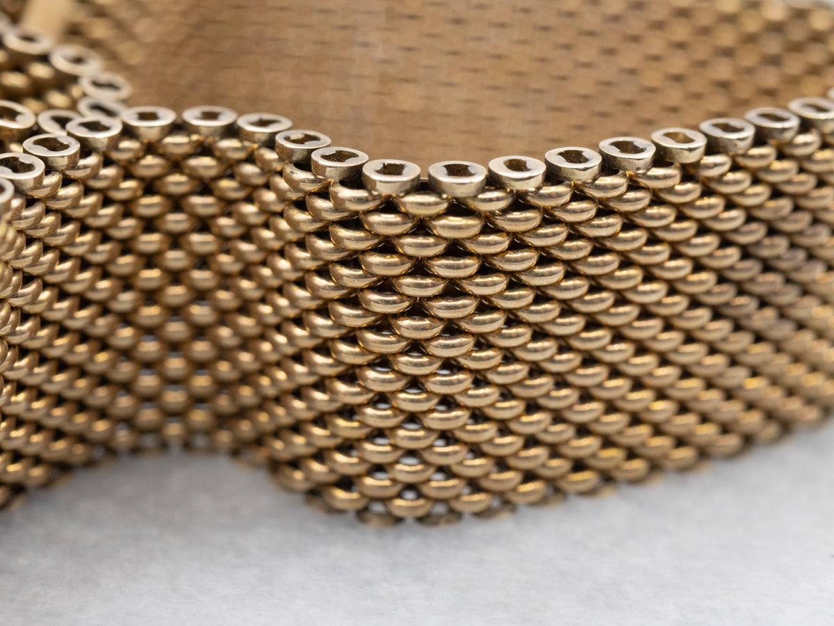 This mesh bracelet is from the Victorian era and comes complete with its original enamel, dating to the late 1800s. It slips over the hand like a bangle and then is adjusted by moving the slide until the fit is comfortable, making it wearable on even a large wrist. This handsome piece is a true collector's item!