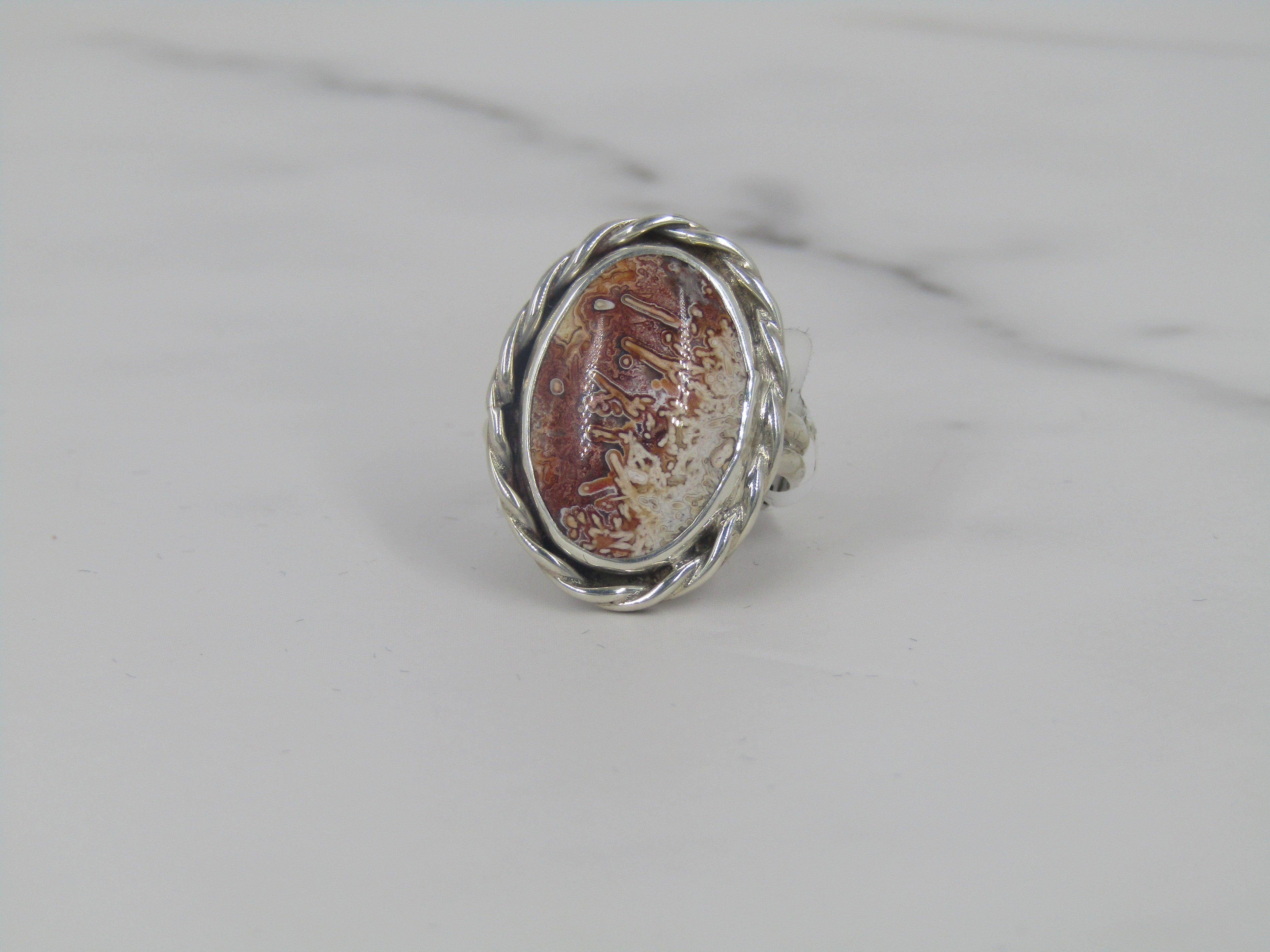Sterling Silver ring with lace agate oval center and twisted rope border.