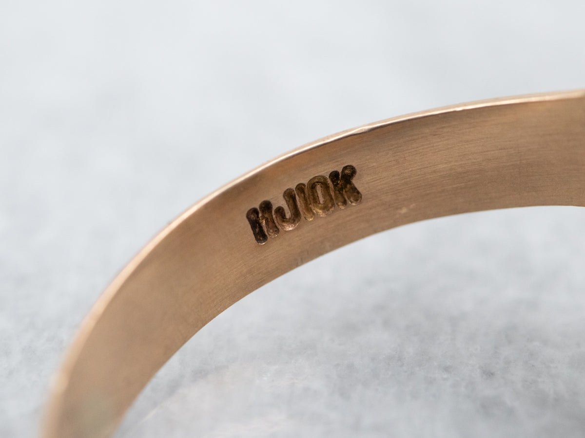 This handsome signet ring features a stylized botanical pattern on the shoulders and deeply grooved lines. Set low to the hand, this would make a perfect gift for a birthday or graduation.
