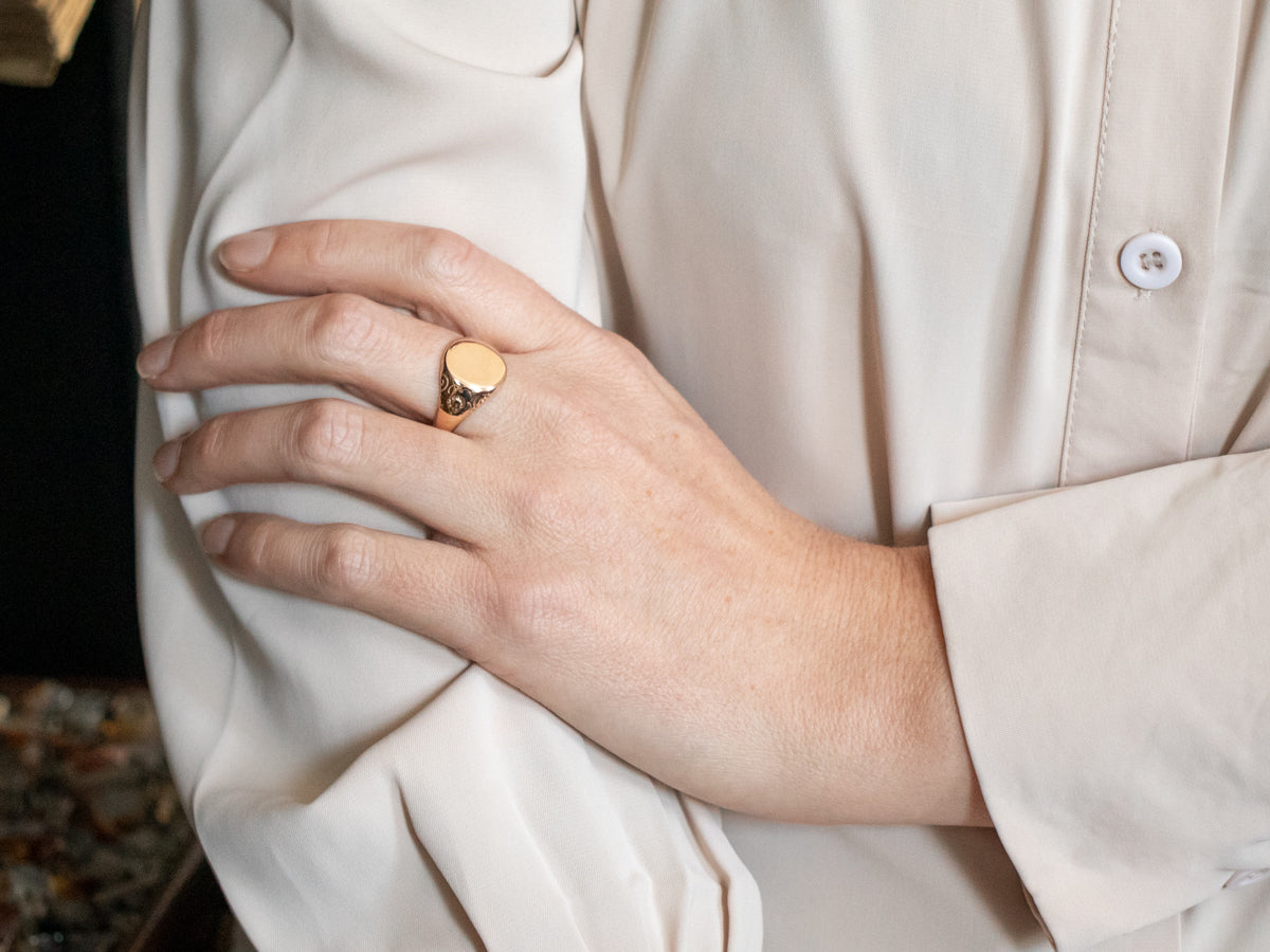 Sweetly detailed, this low-set signet ring is suitable for everyday wear! Each shoulder of this lovely ring is embossed with beautiful flowers! Subtle and evocative, this gold signet ring can be engraved with any crest or monogram you'd like!