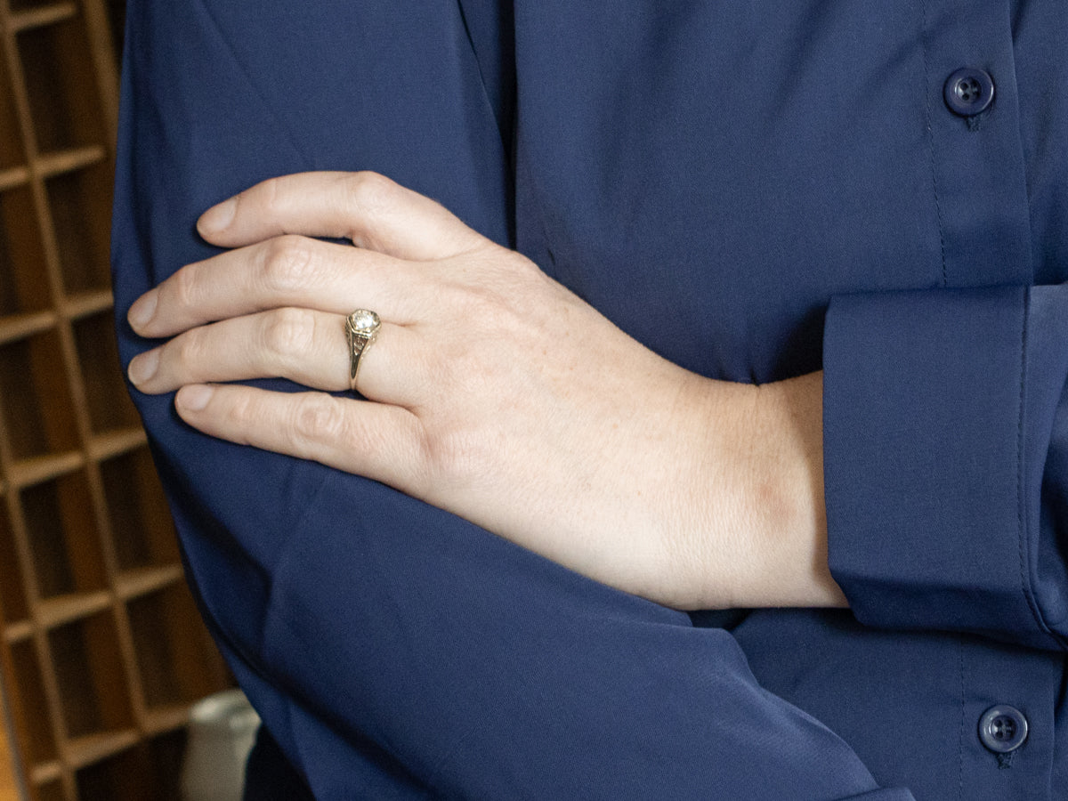 What a precious ring that dates to the early 1920s! Beautiful scrolling filigree work cascades from the center diamond down the shoulders, bringing elegance even to the back of the ring. We've set this mounting with a beautiful, twinkling diamond. The smooth, polished multi-prong setting gives the diamond a pretty frame as well as added security. This ring would make a wonderful engagement or promise ring and would pair with a variety of wedding band styles.