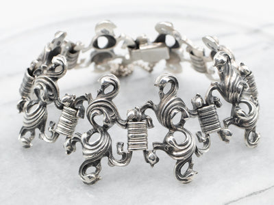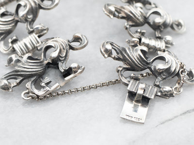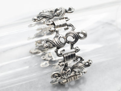 This ornate vintage bracelet is a timeless piece of jewelry crafted from sterling silver, featuring an ornate link design for an elegant finish. Perfect for any occasion, this exquisite bracelet is sure to make a statement.
