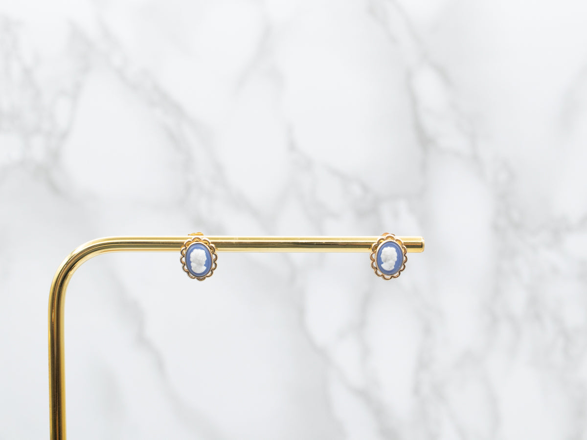 Add a touch of elegance to any outfit with these earrings. Featuring a mesmerizing blue and white oval cut cameo, these stud earrings are perfect for any occasion. A statement piece that is sure to turn heads!