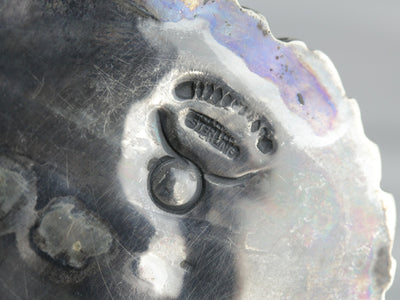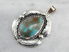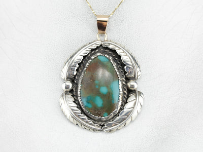 This is a gorgeous Native American sterling silver piece with a classic Southwest theme! Set with an American turquoise in shades of green and brown, the combination of color and textures provides a rich visual texture. We've added a simple bail of yellow gold, completing the piece without distracting from its beauty!