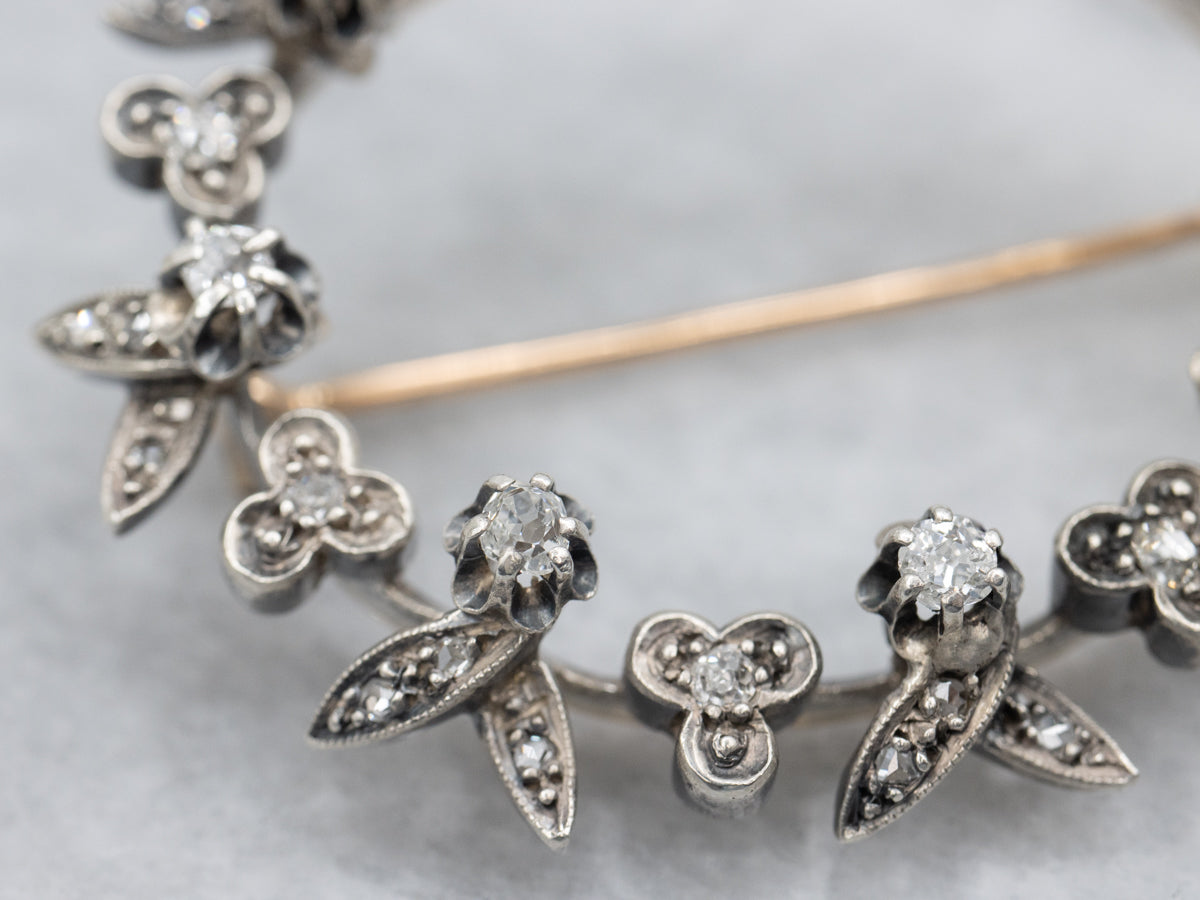 Antique Old Mine Cut Diamond Floral Rose Gold and Sterling Silver Brooch