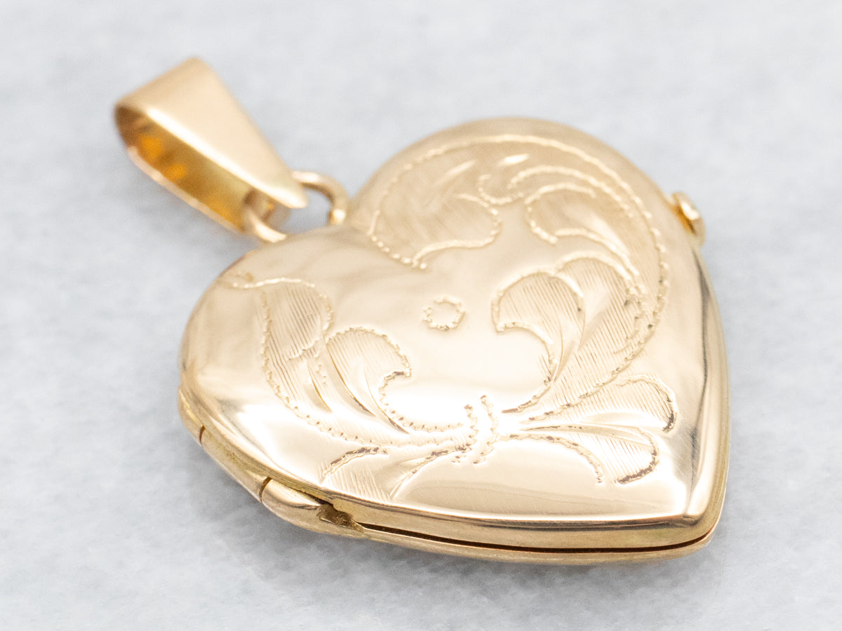 This heart locket is crafted from 18-karat gold and features an etched design. A grooved finish inside the leaves creates a wonderful textural contrast to the polished surface of the heart. This pendant would make a great romantic gift!