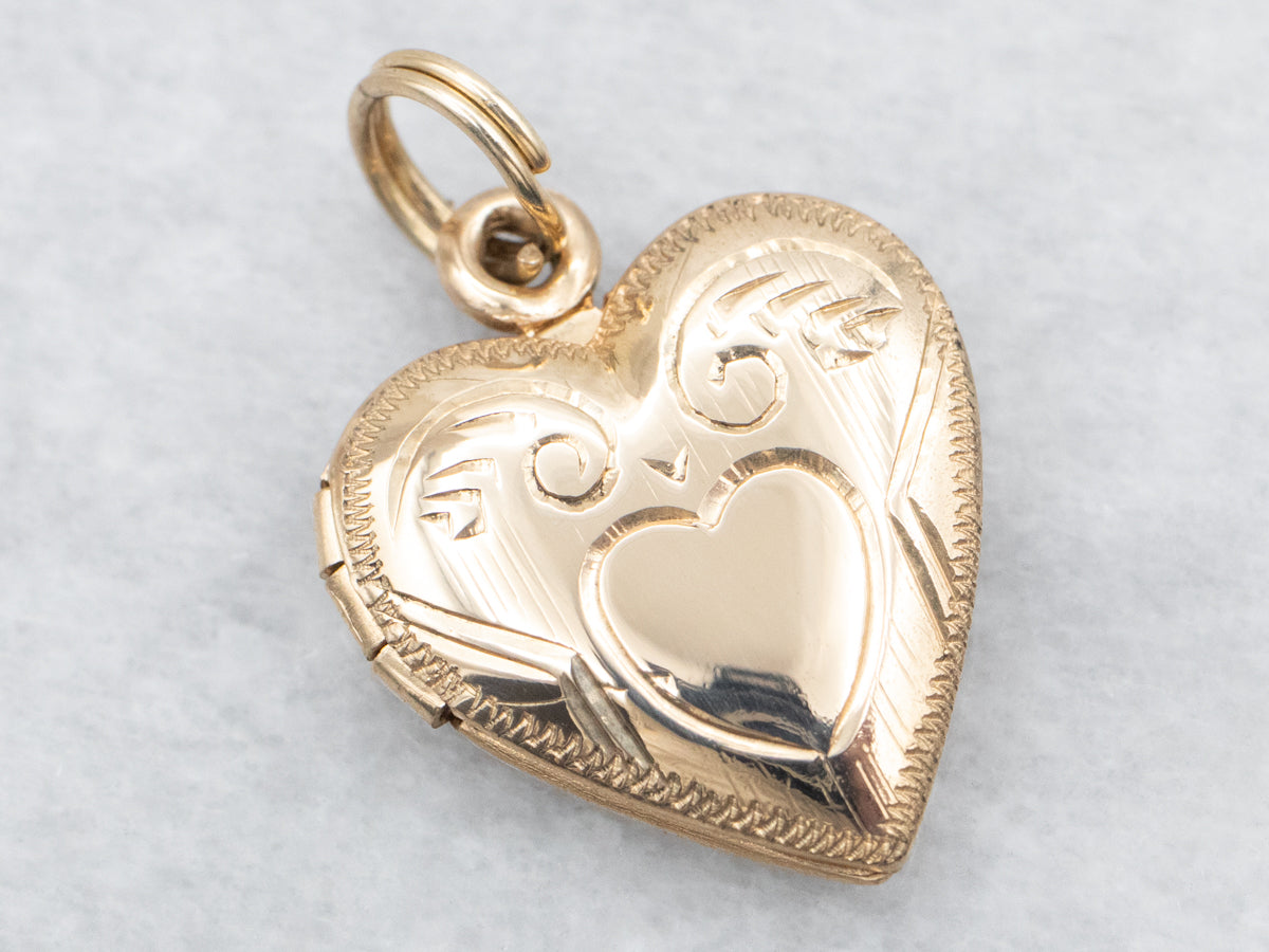 Declare your love with this charming yellow gold etched heart-shaped locket! It's the perfect way to share your secrets and wear your heart on your sleeve.