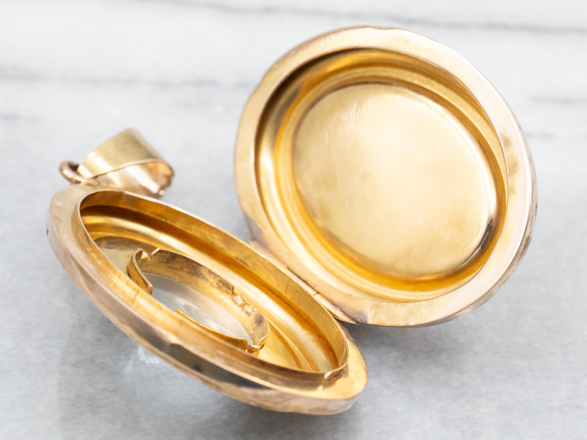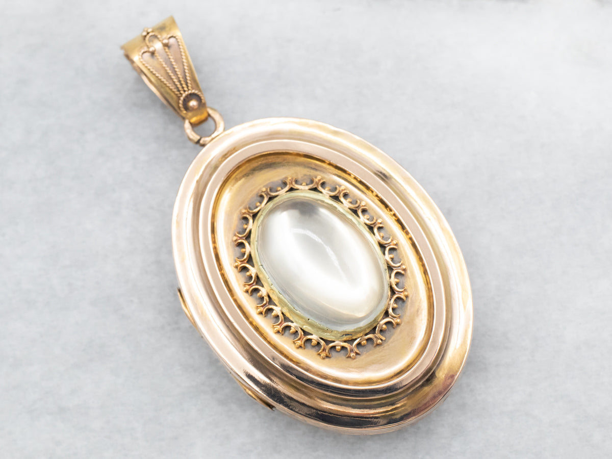 This stunning locket was crafted in the late 1800s featuring bloomed gold and its original monogram. This intricate locket features a classic Etruscan Revival design, set with a stunning new moonstone, this piece is perfect for any antique jewelry enthusiast.