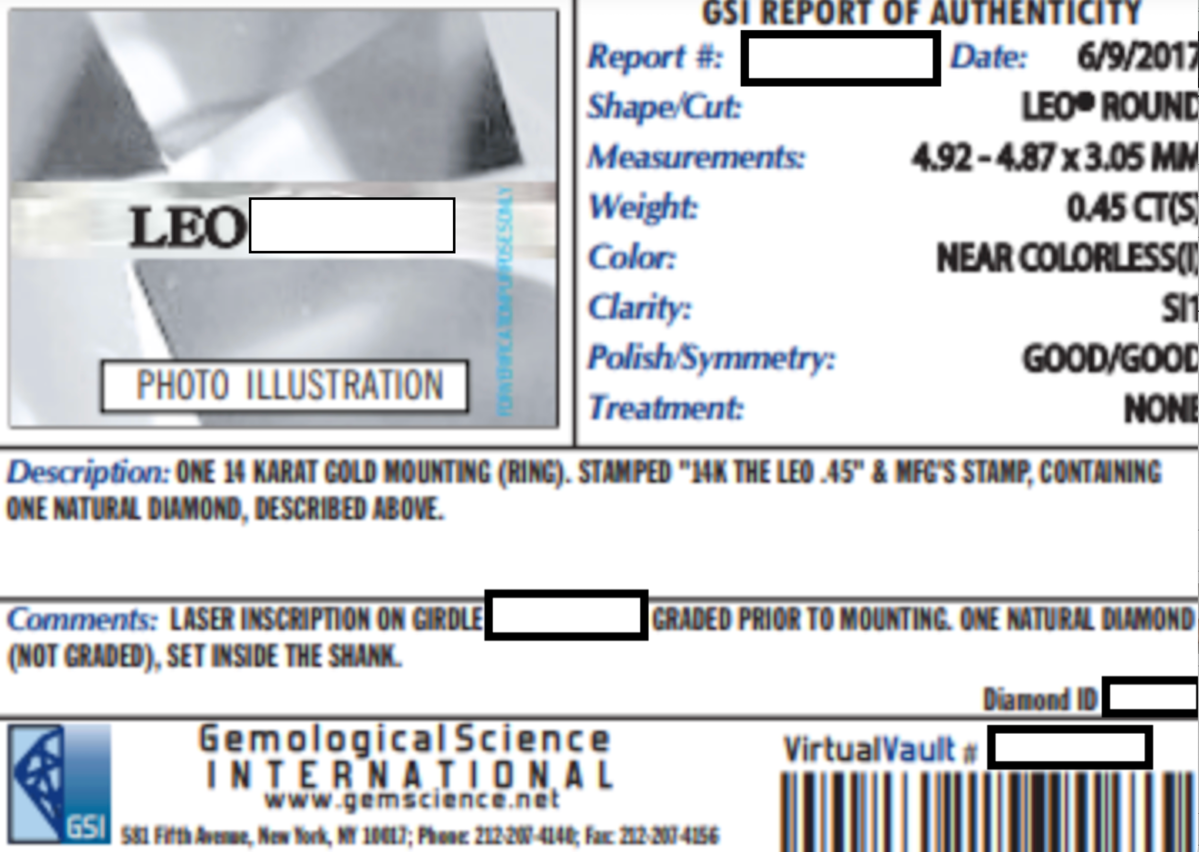 Metal: 14K White Gold Gem: Diamond .45 Carats, SI1 in Clarity, I in Color Gem Measurements: 4.8 mm, Round Accent: Diamond on the inside band Ring Size: 7.25 Marks: ".45 14K LSC-09 THE LEO" Stamped on the inside band GSI Report Number: 170********