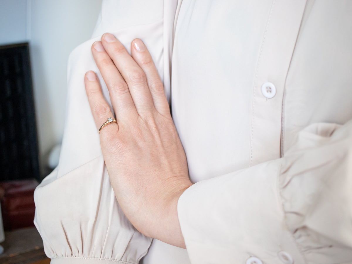 This engagement ring is simple and traditional, with a perfectly balanced silhouette. A lovely, low-set head holds the diamond and gently transitions into a sleek and beautifully polished gold shank. Timeless and elegant!